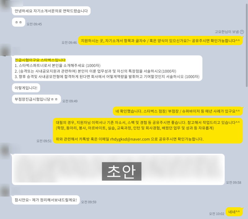 공유해주신 이력서와 자기소개서를 꼼꼼하게 읽어보았습니다. 지원자분의 강점과 경험을 파악하고, 스타벅스의 인재상과 핵심 가치에 부합하는 스토리를 발굴하는 데 집중했죠. 1:1 상담을 통해 지원자분의 생각을 더 깊이 이해하고, 자소서에 진솔하게 담아낼 수 있도록 도왔습니다.