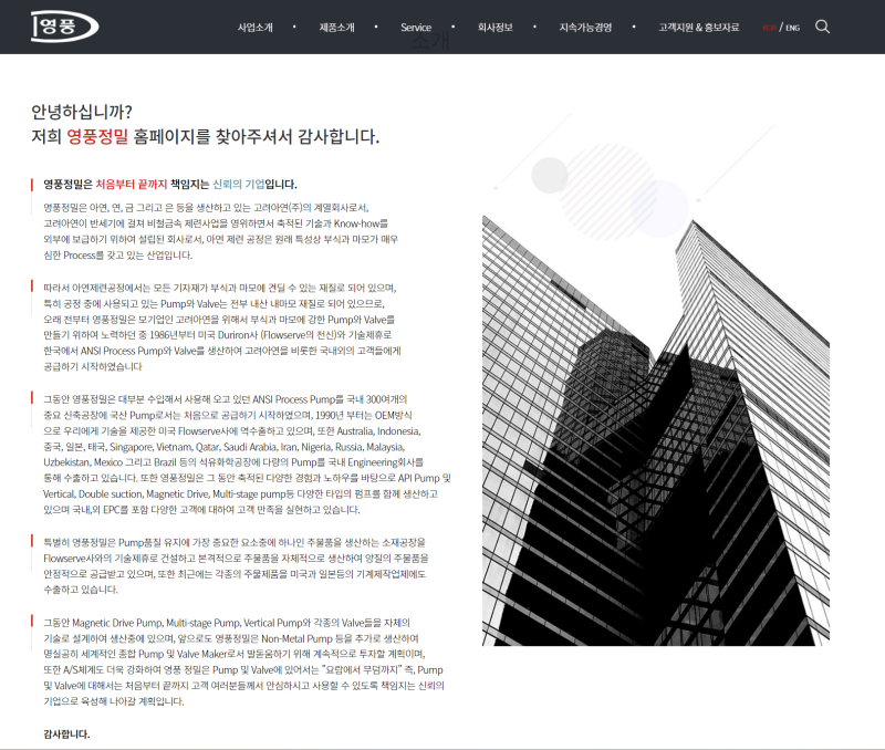 영풍정밀은 아연, 황산, 전자소재 등 다양한 사업 분야에서 혁신적인 기술력을 선보이는 기업입니다. 특히 정밀화학 소재 분야에서 독보적인 위치를 차지하고 있으며, 끊임없는 연구 개발을 통해 미래 성장 동력을 확보하고 있습니다. 영풍정밀은 친환경 기술 개발에도 적극적으로 참여하며 사회적 책임을 다하는 기업으로, 지속 가능한 성장을 추구하고 있습니다.