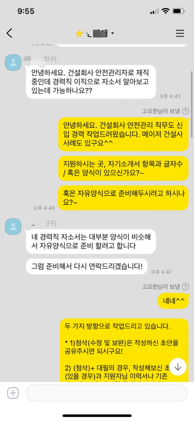 1차 첨삭에서는 전체적인 내용 구성과 흐름을 개선하고, 2차 첨삭에서는 문장 표현과 어휘 선택을 다듬었습니다. 꼼꼼하게 확인하고 준비해야겠죠? 마지막으로, 지원자분과 충분한 커뮤니케이션을 통해 자소서에 진정성을 담아내도록 노력했습니다. 진짜 이건 거의 대필 수준으로 갈아엎었어요! 고객님이 전에 쓰셨던 자소서를 들고 오셨는데, 글자 수도 안 맞고 문장도 엉망이라 첨삭하면서 거의 다시 짰다고 봐야 해요 제발 다음엔 하루 전에는 와주셔요..! 진짜 그래야 저도 여유 있게 도와드릴 수 있거든요