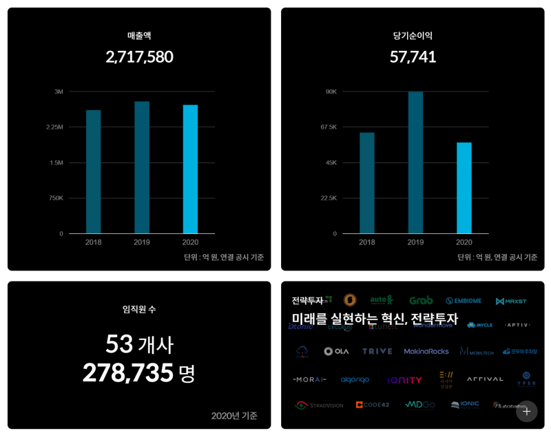- ✔ 주요 사업: 완성차 제조 및 판매(내연기관차, 전기차, 수소전기차 등), 자율주행 기술 개발, UAM(도심항공모빌리티), 로보틱스, 미래 에너지 솔루션 등