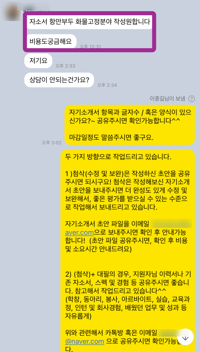 이 과정에서 제가 사용하는 ‘컨설팅 프로세스’는 다음과 같습니다. 공유해주신 이력서와 자기소개서를 토대로, 지원자분의 강점과 약점을 파악하고, 각 항목별로 어떤 내용을 담아야 할지 구체적인 가이드라인을 제시합니다. 때로는 지원자분이 생각하지 못했던 경험의 의미를 발견하기도 하고, 때로는 너무 당연하게 생각했던 부분을 어떻게 어필해야 할지 방법을 알려드리기도 하죠. 진짜 이건 거의 대필 수준으로 갈아엎었어요! 고객님이 전에 쓰셨던 자소서를 들고 오셨는데, 글자 수도 안 맞고 문장도 그대로 첨삭하면서 거의 다시 짰다고 봐야 해요 제발 다음엔 하루 전에는 와주셔요..! 진짜 그래야 저도 여유 있게 도와드릴 수 있거든요 하지만 그만큼 더 큰 만족감을 드릴 수 있다고 확신합니다!