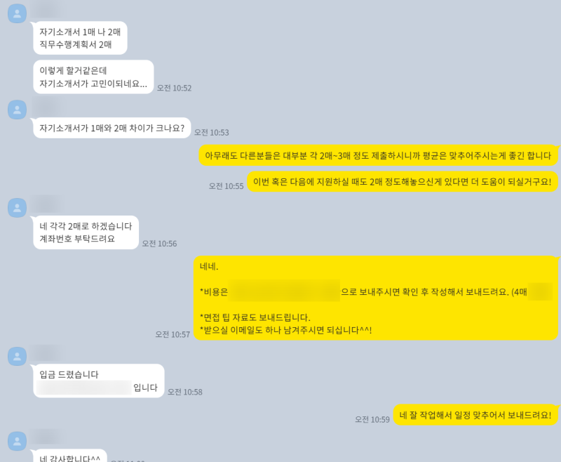 자기소개서 각 문항별로 어떤 점을 수정해야 할지, 어떤 내용을 추가해야 할지 꼼꼼하게 설명드리고, 함께 문장을 다듬어 나갔습니다. 진짜 이건 거의 대필 수준으로 갈아엎었어요! 고객님이 전에 쓰셨던 자소서를 들고 오셨는데, 글자 수도 안 맞고 문장도 그대로 첨삭하면서 거의 다시 짰다고 봐야 해요 제발 다음엔 하루 전에는 와주셔요..! 진짜 그래야 저도 여유 있게 도와드릴 수 있거든요