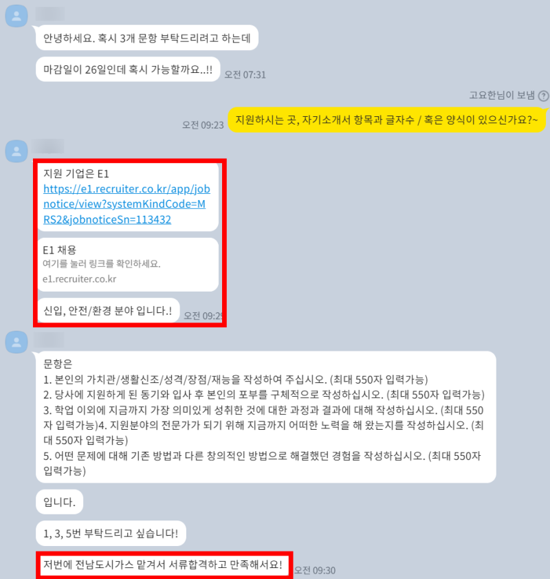 E1 자소서 첨삭 대행 작성 진행드렸습니다.